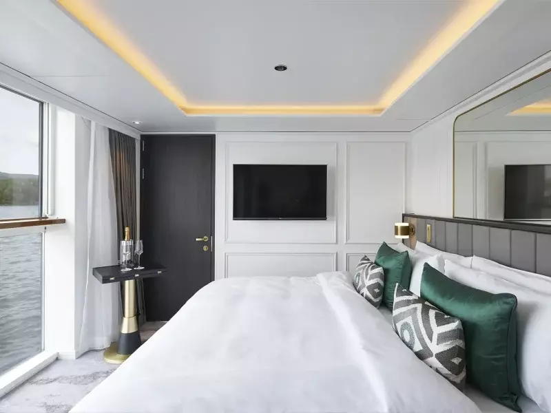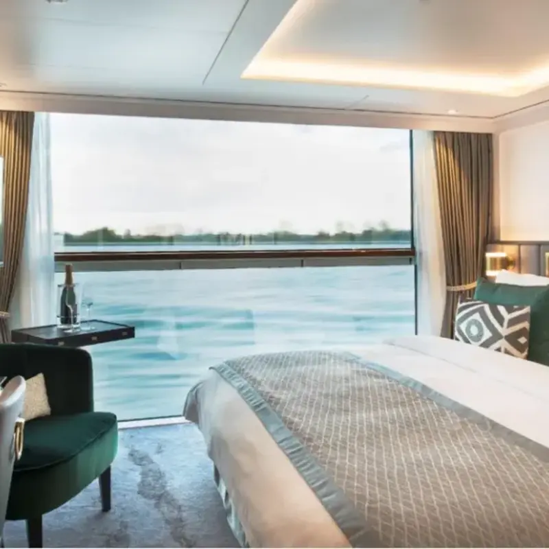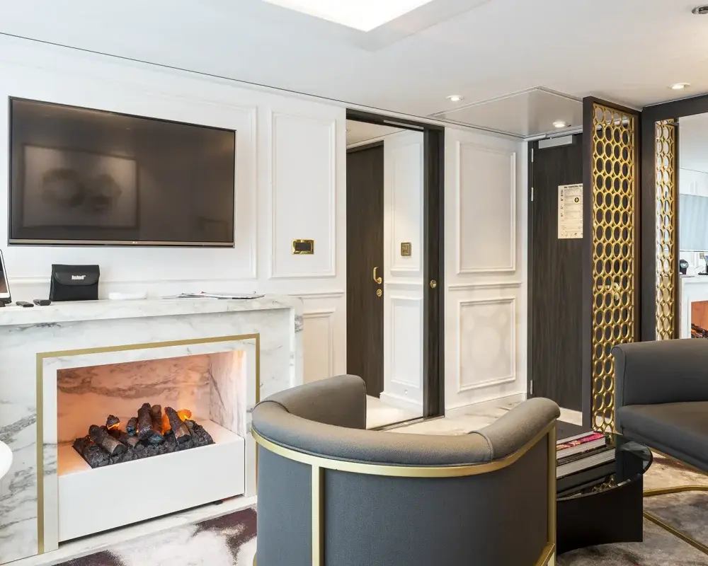With a fireplace, spa-like shower with double vanity sinks, separate European-style water closet, make-up counter, spacious living and dining area, a large walk-in closet (including a safe for your previous valuables), dual infinity balconies, a river-facing King-sized bed, reading lights and binoculars, your Suite is equipped with everything you will need.