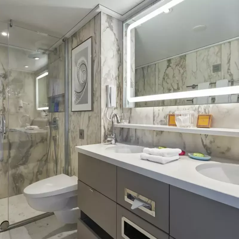 Our suites can be connected to an adjacent Category A stateroom to create a 2-bedroom, 2-bath suite, measuring more than 750 square feet.