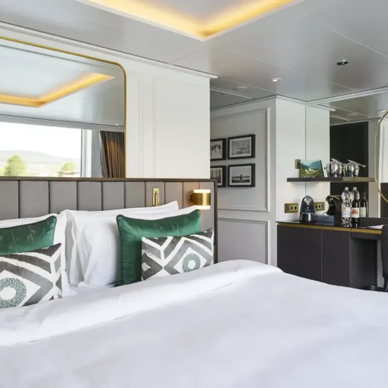 With a fireplace, spa-like shower with double vanity sinks, separate European-style water closet, make-up counter, spacious living and dining area, a large walk-in closet (including a safe for your previous valuables), dual infinity balconies, a river-facing King-sized bed, reading lights and binoculars, your Suite is equipped with everything you will need.